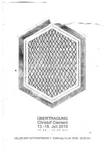 Es zeigt eine kolorierte Netzstruktur, wirkt etwas verloren und der ein oder andere Besucher wird es sicher erst auf dem Rückweg nach oben entdecken. Es ist das Grundmotiv der kleinen Schau. Auch in den drei folgenden „Bildern“ kehrt das rautenförmige Geflecht wieder und ruft Assoziationen zu Einkaufsnetzen, Drahtzäunen oder Bodengittern hervor. Diesen Gegenständen ist gemein, dass sie auf unterschiedliche Weise einen Raum definieren oder öffnen – als Volumen, als Grenze, als Bereich usw. Zusammen mit dem Ausstellungstitel „Übertragung“ könnte dieses Motiv hin zu Netzwerken führen, durch welche Informationen gesendet, ausgetauscht, verbreitet, eben übertragen werden.