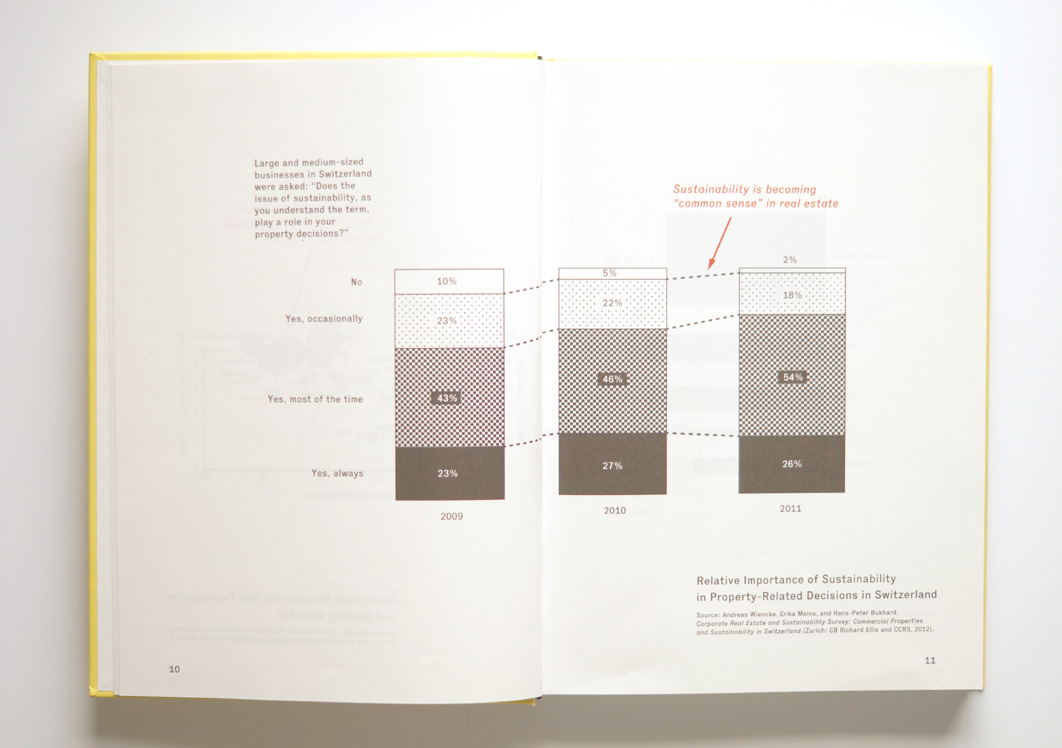 NATHALIE: The visual introduction reflects the overall design and curation of the book. There is no blank endpaper when you open the book; instead, it begins right away with the visual introduction, which is placed before the table of contents. We envisaged Bretschger’s piece as a very clear graphic introduction to the book’s subject, setting up some key thoughts and relationships that recur throughout the book. By exploring a simple yet very complex question—can sustainable construction be economical or even profitable?—Bretschger’s piece sets the tone for the rest of the book.